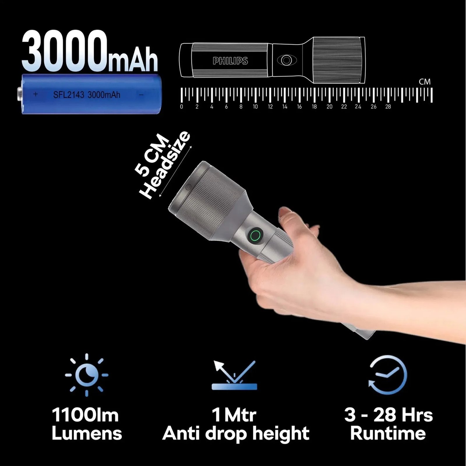 فيليبس مصباح يدوي قابل لإعادة الشحن من سبائك الألومنيوم من سبائك الألومنيوم، 1100 لومن، SFL5141/56 ملخص المنتج * * يوفر 1100 لومن مع نطاق شعاع مثير للإعجاب يبلغ 950 مترًا