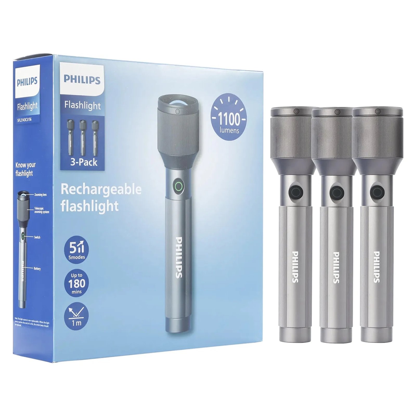 فيليبس مصباح يدوي قابل لإعادة الشحن مصنوع من سبيكة ألومنيوم زووم إل إي دي للطائرات، 1100 لومن، 3 قطع، SFL2143C3 ملخص المنتج * * سطوع 1100 لومن لإضاءة قوية